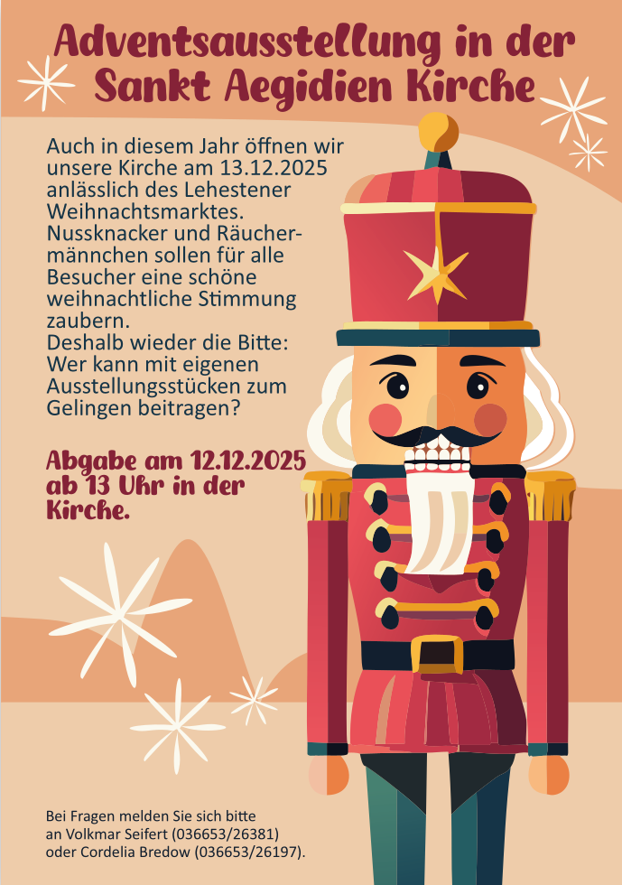 Am 13.12.2025 öffnet die Sankt Aegidien Kirche in Lehesten anlässlich des Lehestener Weihnachtsmarktes. Nussknacker und Räuchermännchen sollen für alleBesucher eine schöne weihnachtliche Stimmung zaubern.